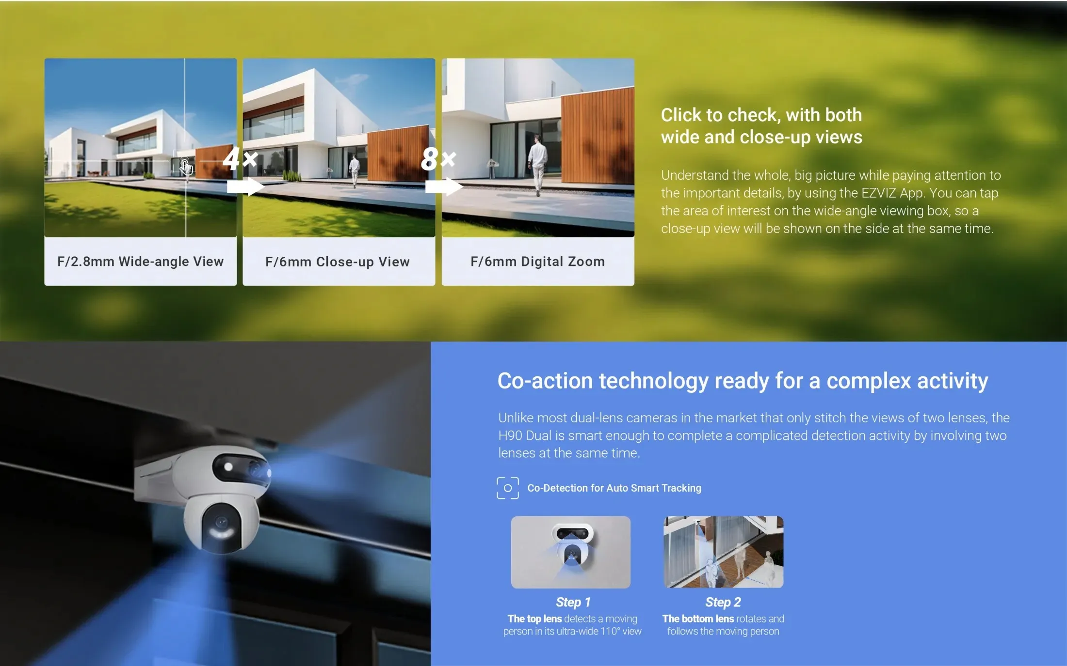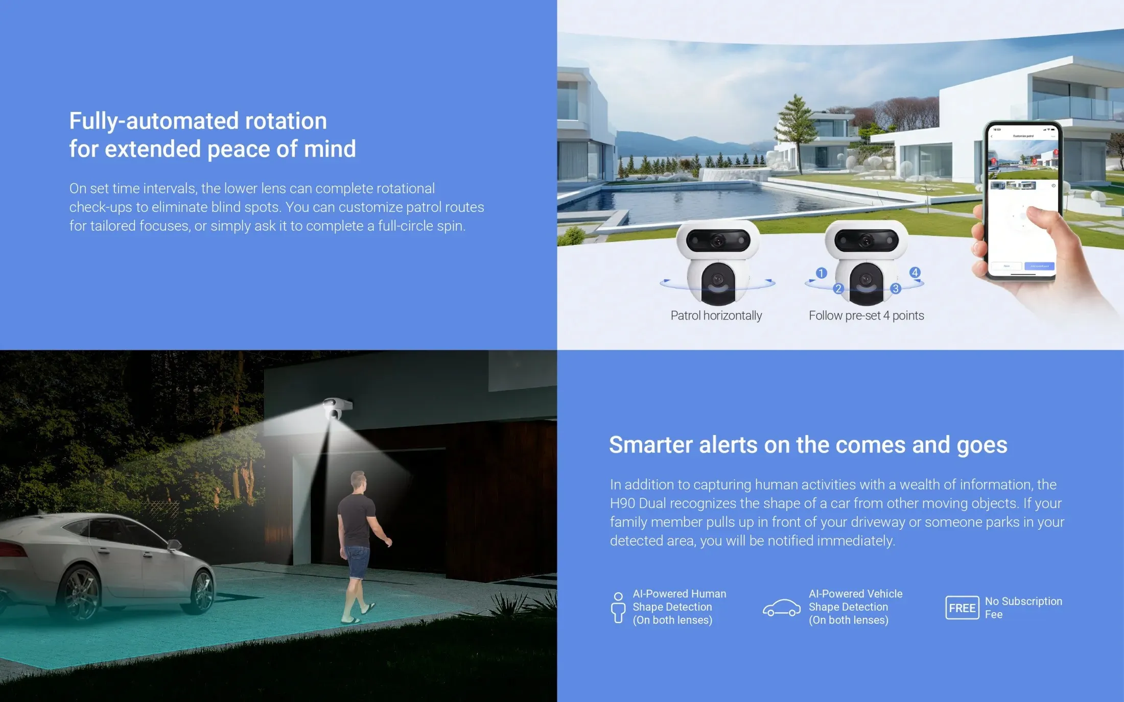 The H90 uses AI-powered detection to identify human and vehicle shapes. This reduces false alerts and ensures you receive notifications only when real activity occurs. Co-tracking technology allows both lenses to work together. When movement is detected, the camera automatically follows the subject, keeping all important details in view.
