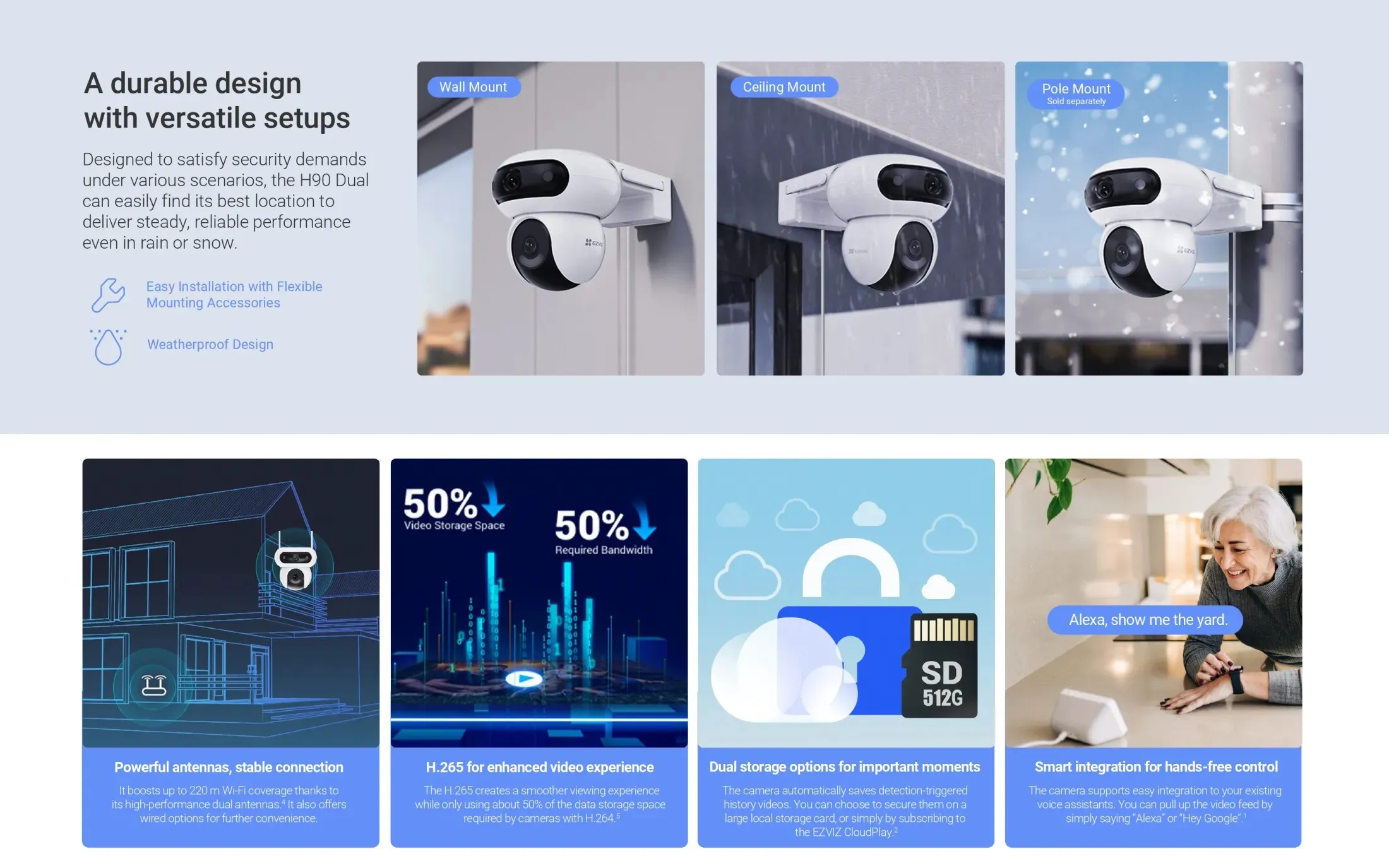 Dual WiFi antennas improve signal strength and stability, especially in areas with interference. The camera supports MicroSD cards up to 512 GB and H.265 compression, which reduces storage use while keeping video quality high.